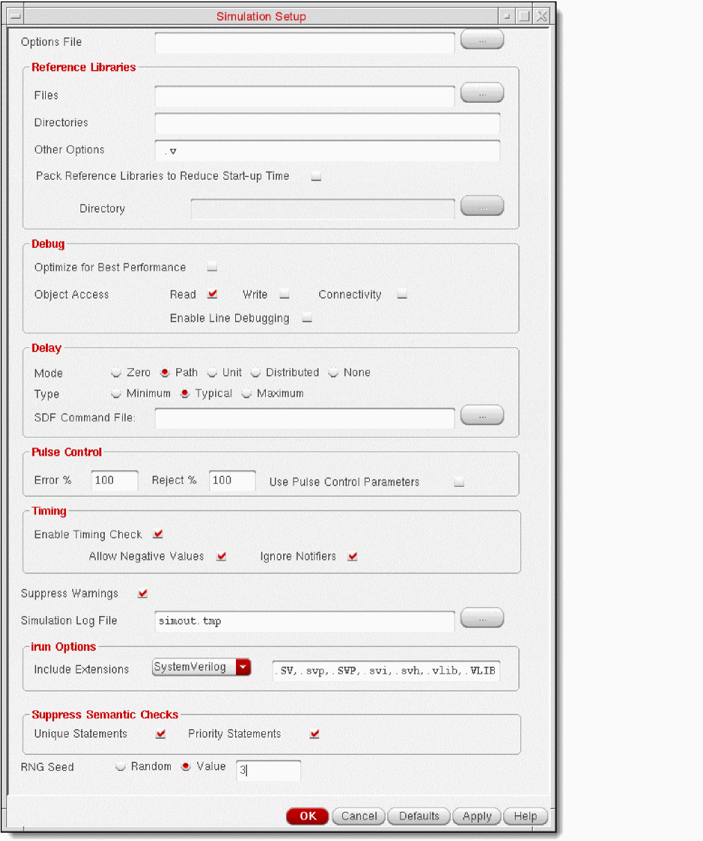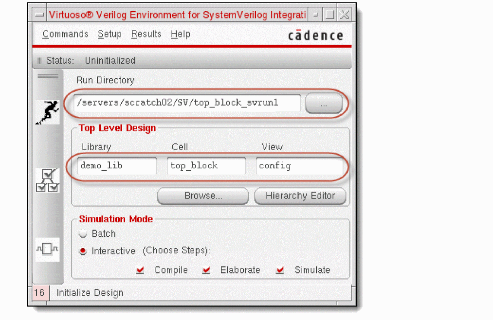Cadence recommends that you initialize the run directory and configure the netlist and simulation options using the graphical user interface of SystemVerilog Integration Environment. If required, you can modify settings in the simulation environment configuration file .simrc or si.env. Note that settings in .simrc have presidence over settings in si.env.