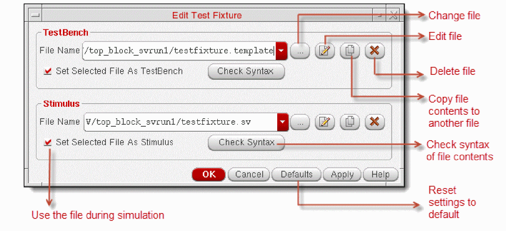 testfixture.sv: The default stimulus fileThe test fixture files should have the valid file extensions listed in the Include Extensions field on the Simulation Setup form. You must edit and check the contents of the sample test fixture files before you use them for simulation.