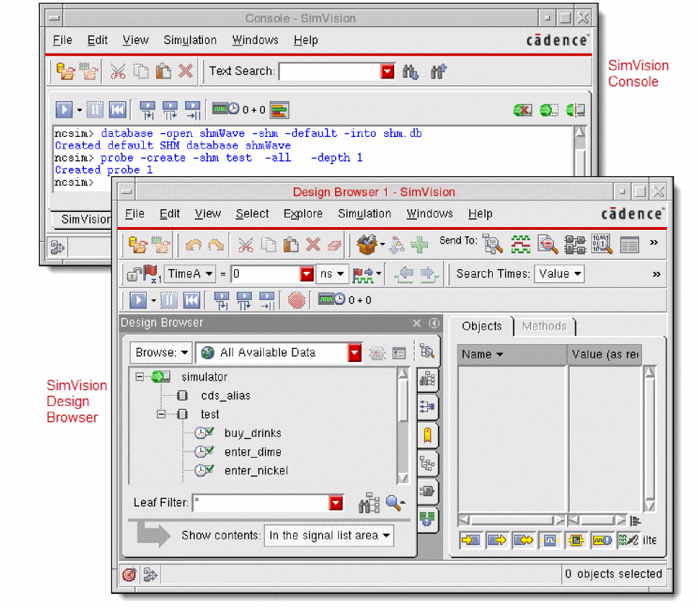 The following figure illustrates SimVision, which has been launched to simulate the sample drink machine design. For details on using SimVision, see the SimVision User Guide.