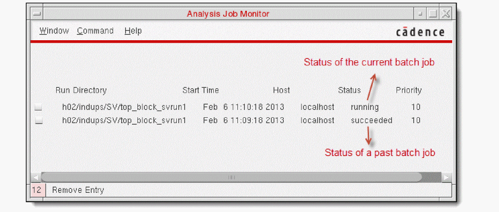 If the Analysis Job Monitor window is open, the environment displays the simulation status. This window also displays the status of the previous batch jobs. It includes an entry for each job and lets you prioritize, suspend, continue, or kill active jobs. For details on using this window, choose Help and see the Simulation Environment Help.
