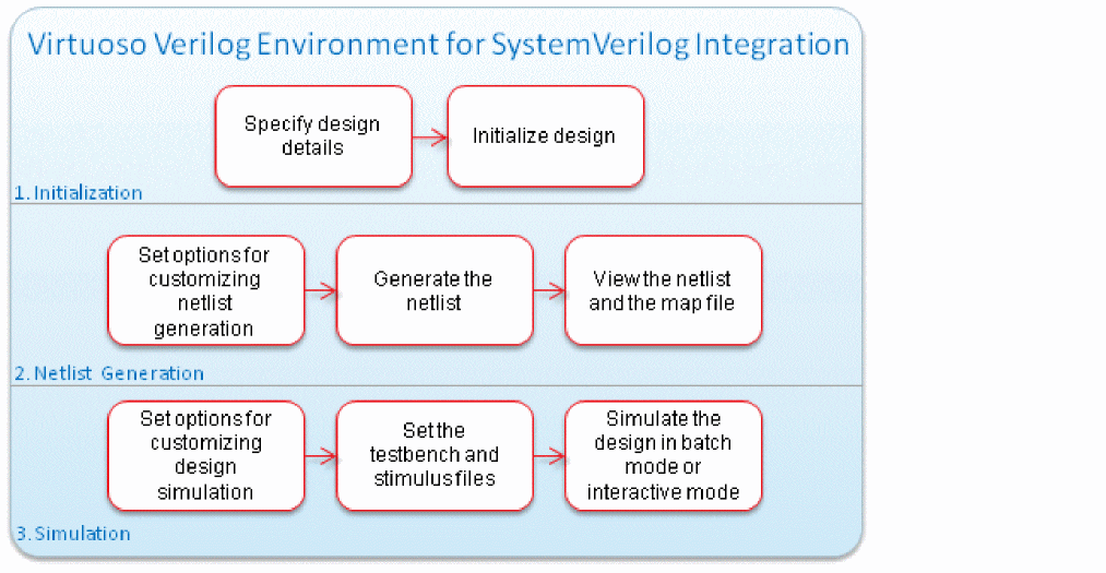 The following figure shows how to use SystemVerilog Integration Environment for netlisting and simulating a design. For details on the functionality, features, generic flow, tool requirements, and the graphical user interface of this environment, see Chapter 1, “Introducing SystemVerilog Integration Environment.”