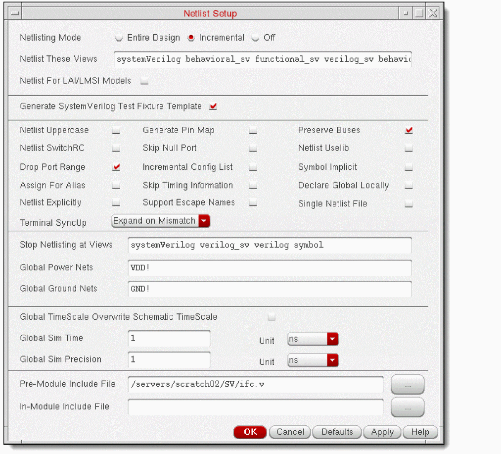 .simrc file in the run directory and store your default netlist generation and simulation configurations in this file. Configurations in .simrc overwrite configurations in si.env.hnlPrintNonAnsiSV to t in the .simrc file.The following figure illustrates the Netlist Setup form and the table describes the configuration options. For information on the configuration flag associated with the fields in this form, see “Configuring Flags for Netlist Generation”.