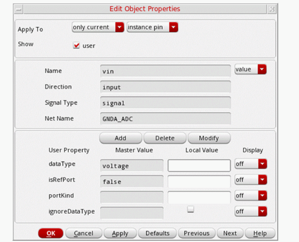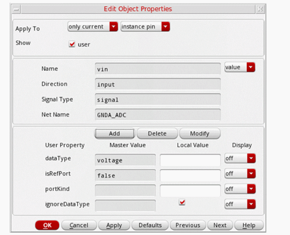 lai_verilog or lmsi_verilog view property to an instance on a Virtuoso Schematic Editor schematic, use the Edit – Properties command available on the schematic window. For details, see the Virtuoso Schematic Editor L User Guide. |