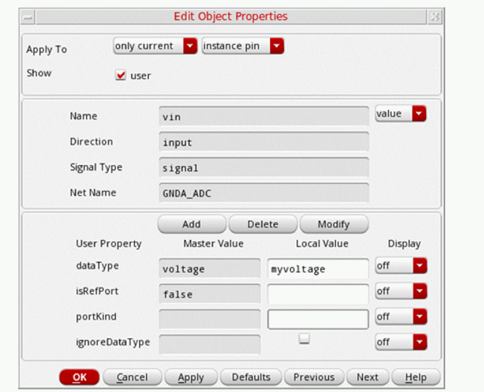 When you setignoreDataTypetonilonI2and the local valuedataTypetomyvoltage, the local valuemyvoltageof the specific instance is used, instead of the master valuevoltagethat is set on the symbol cell.The following example shows how the netlist displays the port information in this scenario: