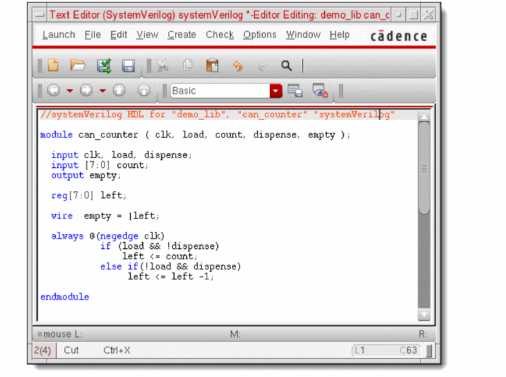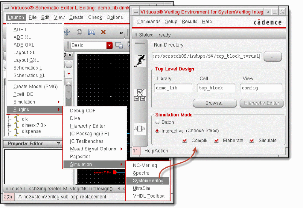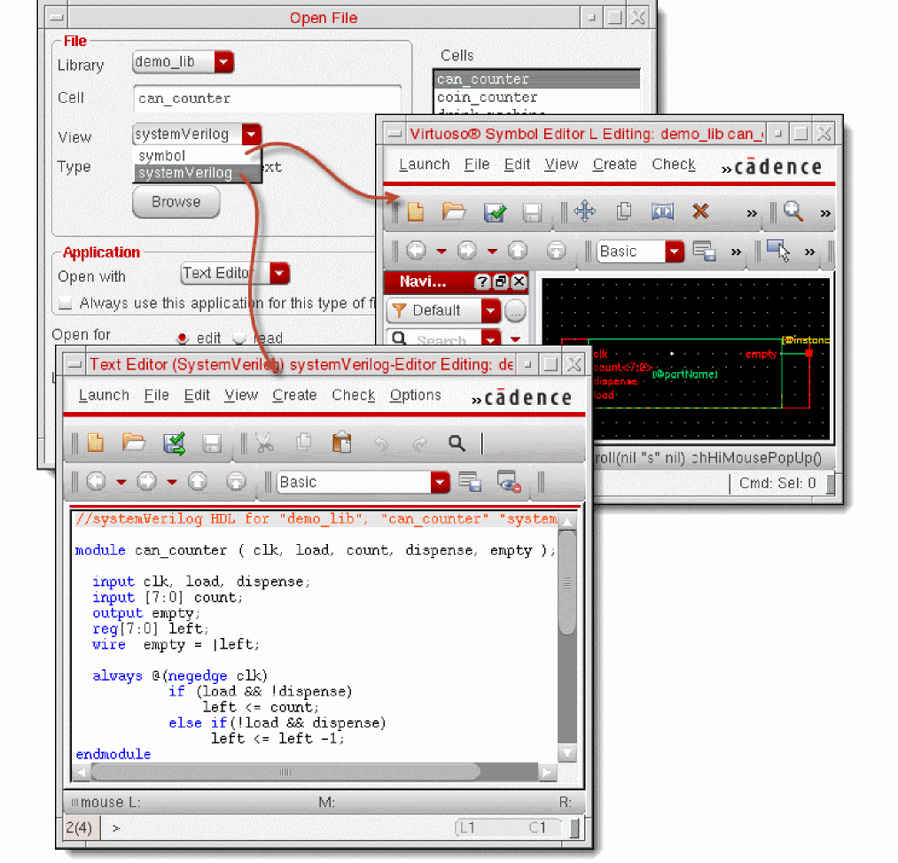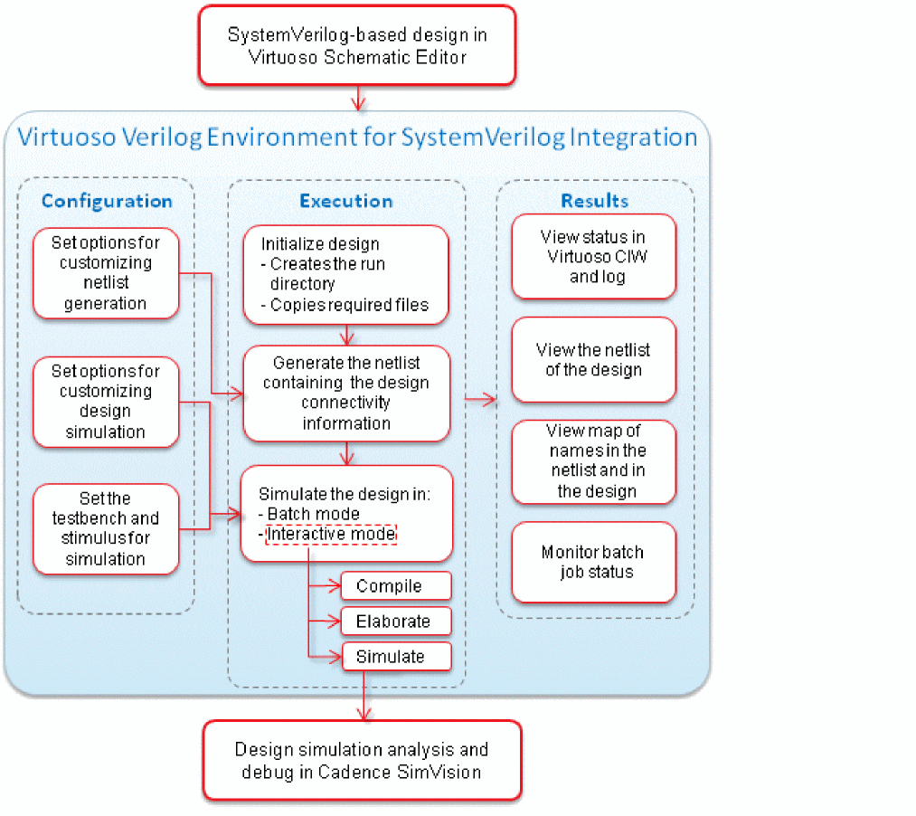 Virtuoso® Verilog Environment for SystemVerilog Integration (SystemVerilog Integration Environment) is an environment for generating netlists of SystemVerilog-based digital designs. This environment also integrates with other Cadence tools to simulate and debug designs.
