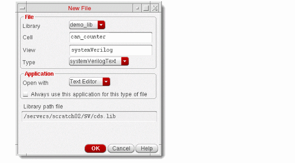 - Select the library, cell, and view of the new cellview file. You can choose to view the symbol or the SystemVerilog text-only view.