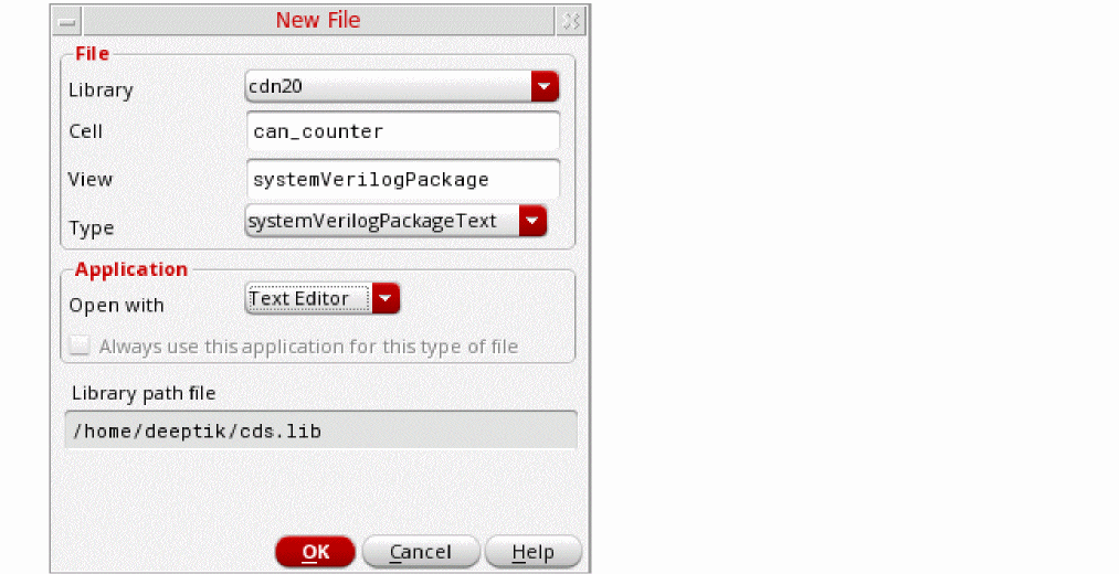 Virtuoso creates a blank SystemVerilog cellview and stores it as LibraryName/cellName/viewName/package.sv. It also displays this file in Virtuoso Text Editor. -
