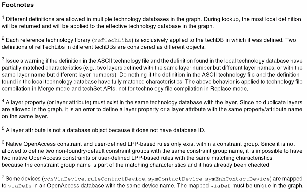 You can duplicate some technology data in more than one technology database if doing so accomplishes your design flow objectives. Duplicating most technology data, however, creates conflicts, which must be avoided.