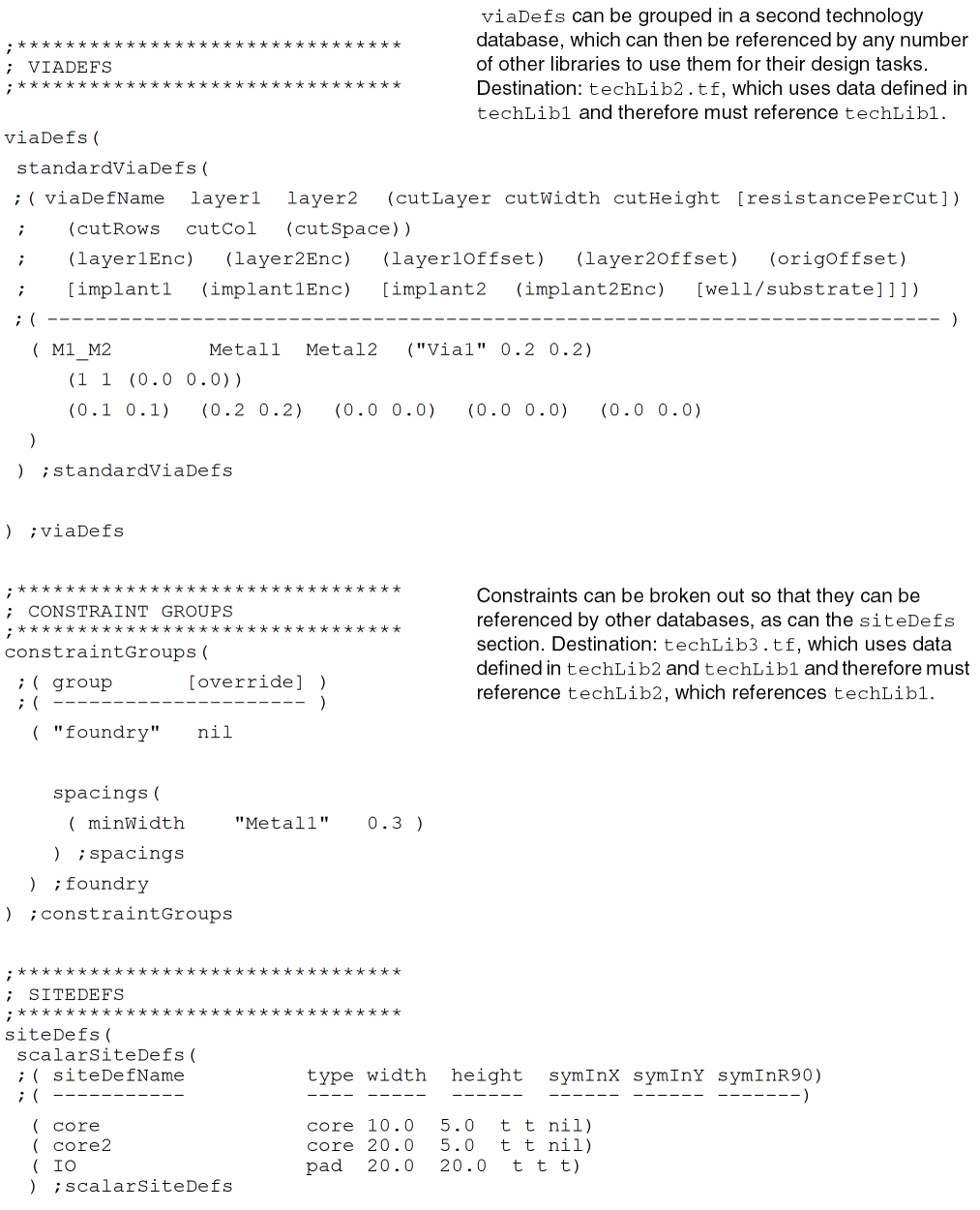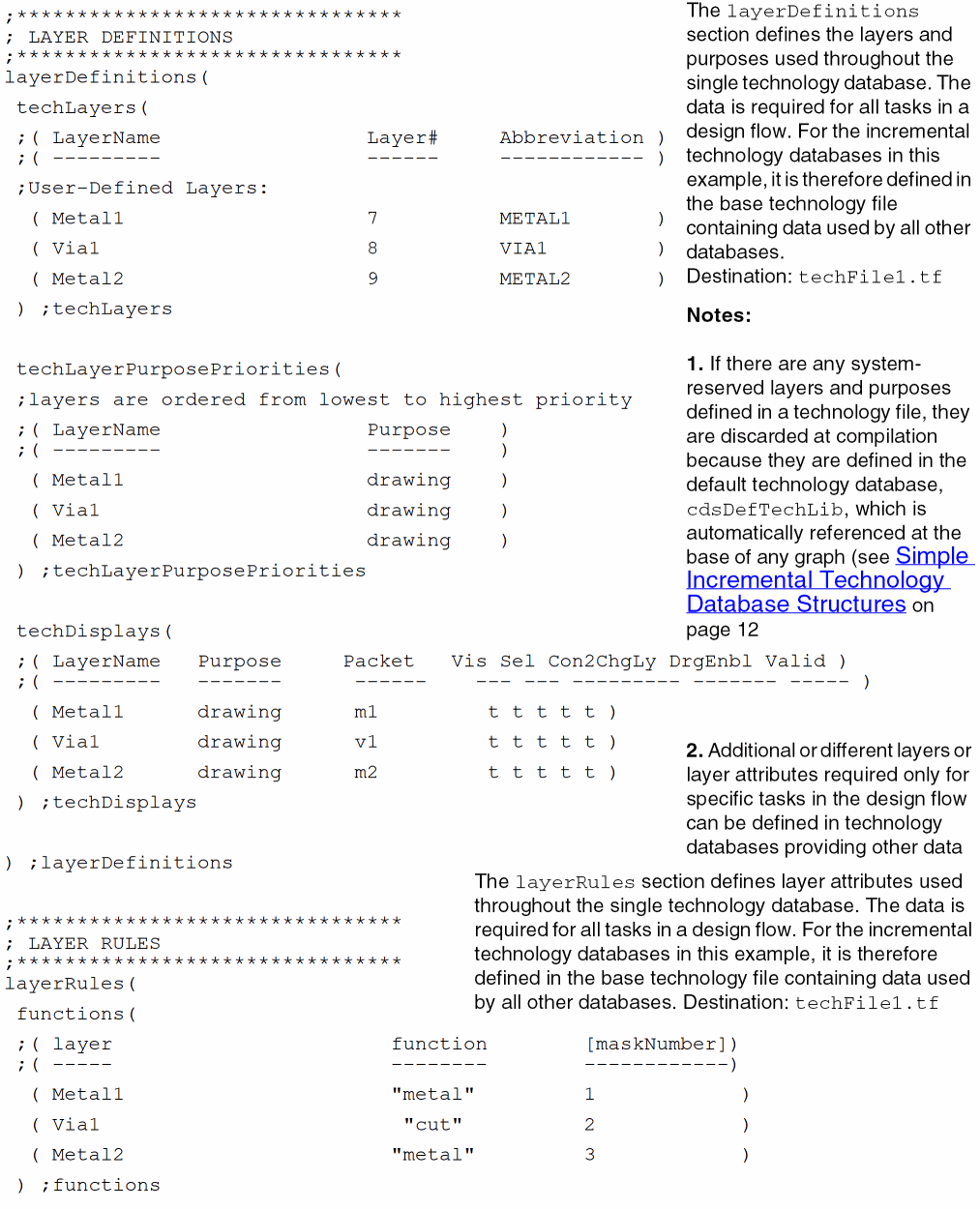 The following is a single ASCII technology file containing all of the technology data required for all of the design tasks in a design flow. If another design task requires different technology data, an entirely new technology file must be created and loaded, even if it uses some of the technology data already defined in this technology file. For example, another task might require all of the same basic layers and purposes, but different constraints, viaDefs, or viaSpecs. Creating a single technology database would require copying and editing the entire original technology file. If the file is split into multiple files for incremental technology databases, then it is necessary to create an ASCII file only for what needs to be different.