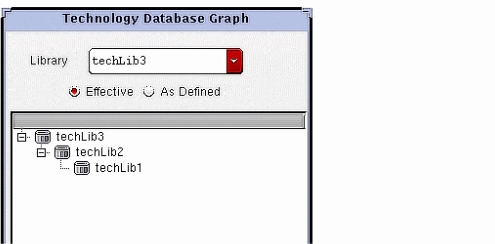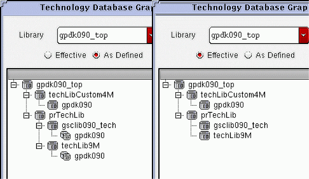 The following are the database graphs (As Defined and Effective) that result after loading the sample technology files in reference order to create the incremental technology databases.