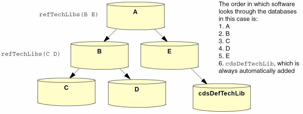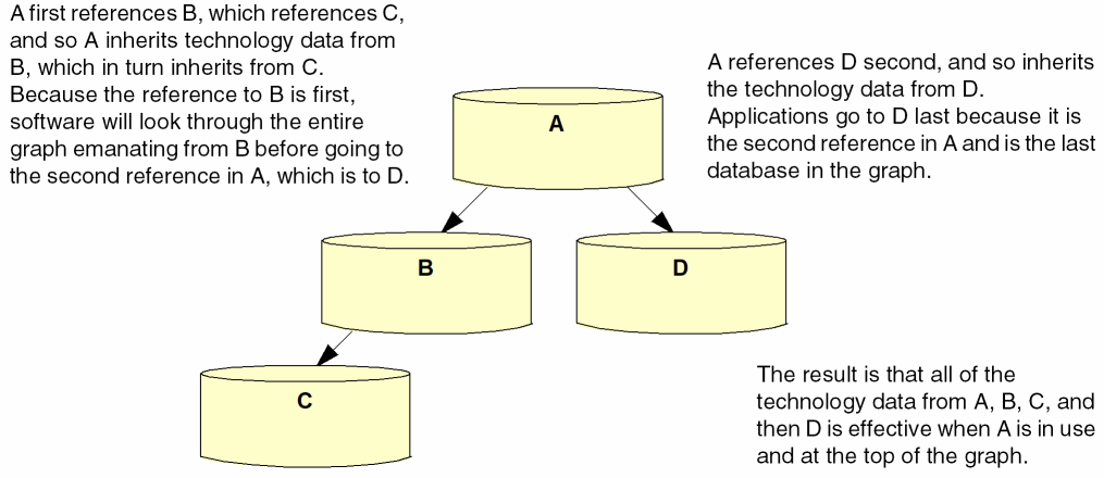 The order in which you reference technology databases from other technology databases determines the order in which software looks through the graph to find data. It will go to the first referenced database and then go through its referenced databases before returning to the second referenced database. The following illustrates this order: