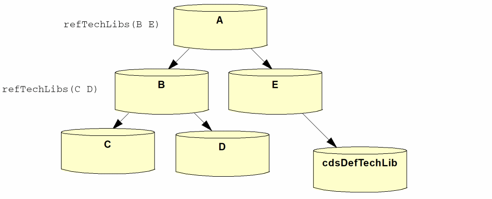 A design library or an application can reference any technology database whose entry point in a graph provides only the technology data it needs.This technology database is the local technology database for that design library. The complete graph of databases initially referenced by the local database is the effective technology database. For example, in the following simple graph, in which the technology databases contain data grouped by type,