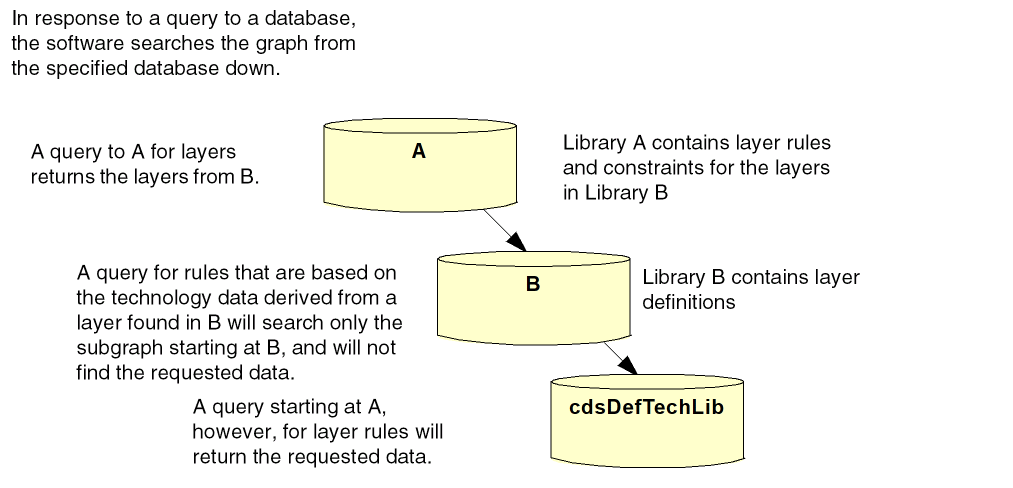 When you use SKILL to retrieve data from an incremental technology database, always query the technology database from the top of the graph, and never query based on derived technology data from an object. If you do, you may get incorrect results, depending upon where the object is defined in the graph. The software searches the graph from the technology library containing the object down; if the data requested is above that technology library, it will not be found. The following is a simple illustration of how queries work: