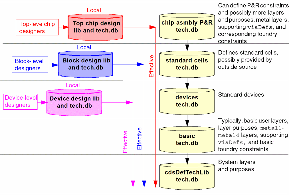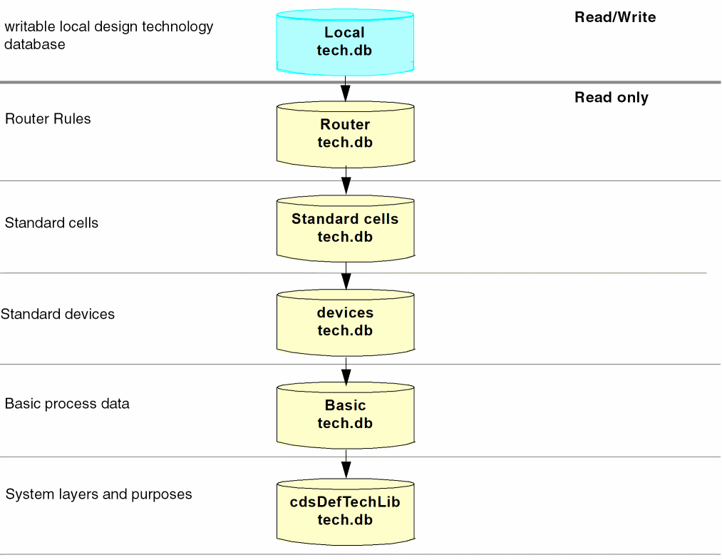 The ability to establish references among technology databases allows the incremental inclusion of technology databases as needed by various applications throughout the design process. Technology databases can be supplied by multiple sources (for example, the foundry, IP provider, and designer) and can be tailored to meet the requirements of different tasks in the design flow (for example, device-level design as opposed to top-level interconnect creation). Avoiding the limitations placed on design teams when a single read-only technology database is supplied, this structure provides flexibility by allowing designers to