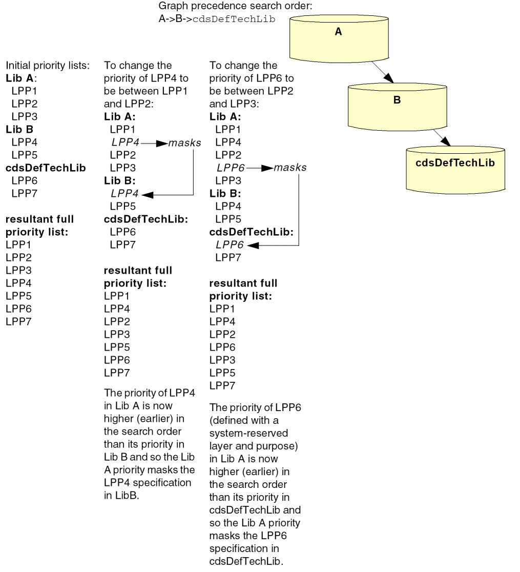 A technology database automatically inherits the layer-purpose pair priorities defined in cdsDefTechLib unless they are redefined higher in the graph. When inherited from cdsDefTechLib, the priorities are appended to the layer-purpose pair priority list specified in the technology database for user-defined layer-purpose pairs. When priorities are redefined, they are inherited based on the graph