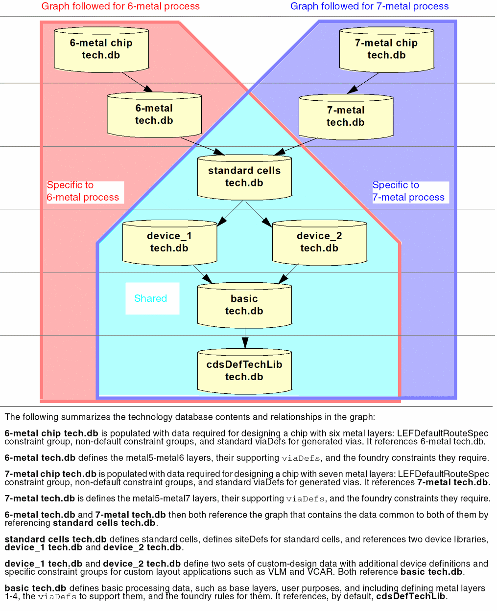 Technology databases supporting a 7-metal process, although not used by the designs in this graph, are available for 7-metal process designs when needed. The 7-mtl P&R rules technology database contains the LEFDefaultRouteSpec constraint group, non-default constraint groups, and standard via definitions for generated vias needed for a 7-metal process. The 7-metal technology database provides the layers, via, and foundry constraints required by 7-metal processes in addition to the shared base data.