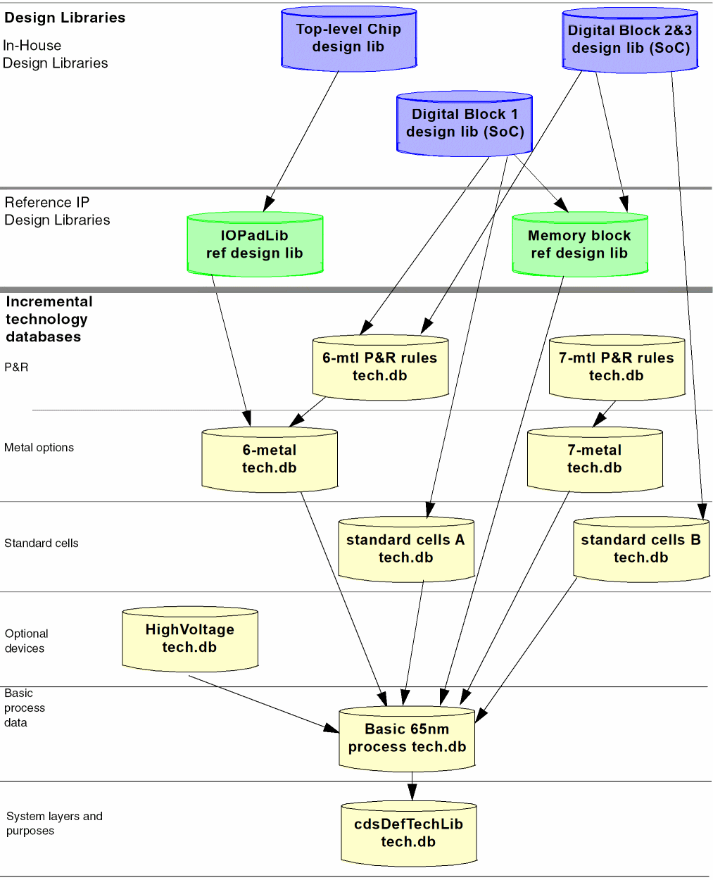 The following example illustrates a complex incremental technology database graph. The graph provides multiple entry points, designed to supply each design library with the data it needs without burdening it with data that it does not use but that is required by other design libraries setting references higher in the graph. It also allows defining technology data required by more than one design library only once in a technology database that can be shared.
