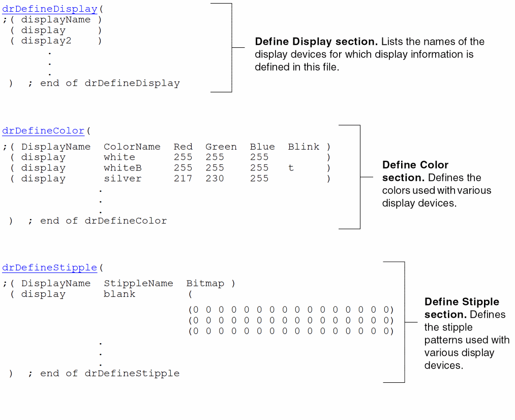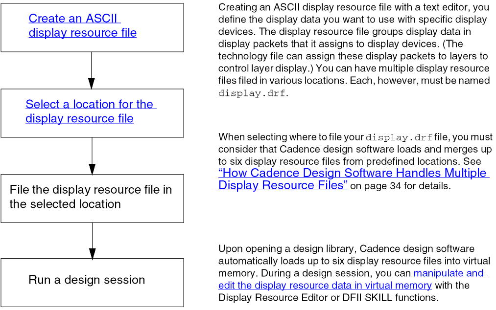 At startup, Cadence design software creates a display resource file in virtual memory for use during a design session. The virtual memory display resource data is based on five display.drf files present at standard locations and the files loaded by explicit usage of the drLoadDrf API.