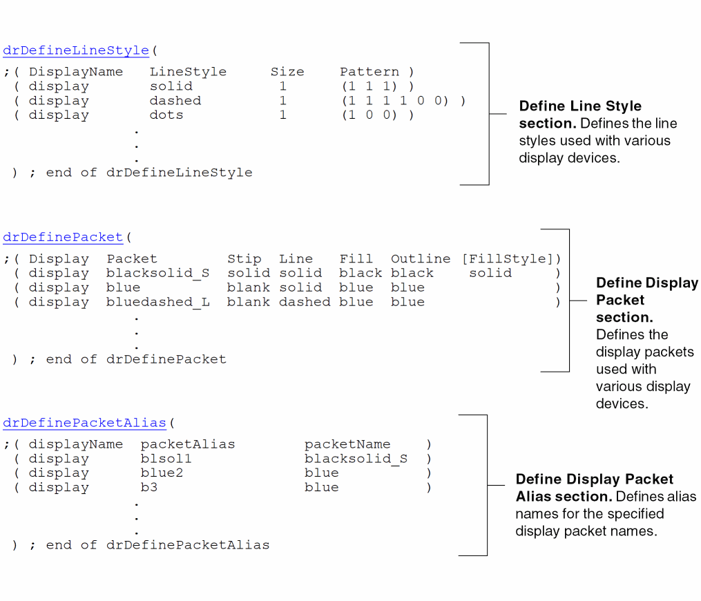 The display packet definitions section (drDefinePacket) defines the display packets used with various display devices. This section applies specific stipple patterns, line styles, fill colors, outline colors, and fill styles to display packet names and associates them with specific display devices.