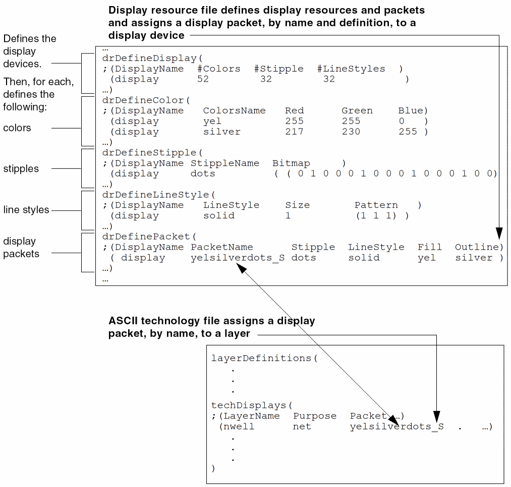 A technology database can contain assignments of display packets to layers to control how layers are displayed. This information can be specified in the techDisplays subsection in the layerDefinitions section of the ASCII technology file. You can also apply, change, and redefine display packets assigned to layers with the design software graphical user interface.