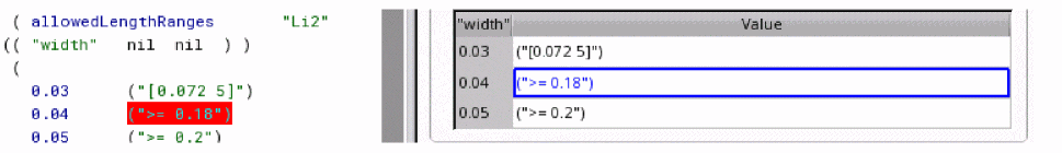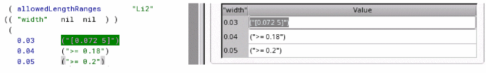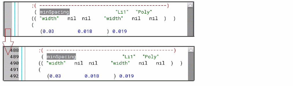 techLibbecame an ITDB where techLib inherits the system reserved layers and other system specific information fromcdsDefTechLiband technology file load ignores this information from ASCII technology file. Therefore, when the technology file is dumped again following the standard ITDB convention, only the top level techLib which does not have the system reserved info is dumped back. - The original technology file has a spacingTable in which all the rule value for all the indexes of the table are not explicitly specified. Let's consider the example given below: