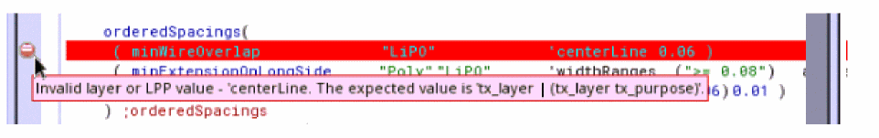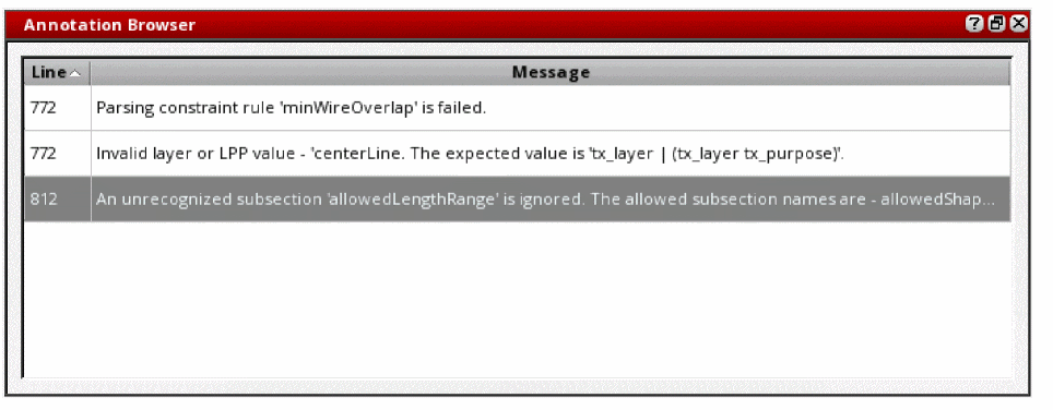 - Annotation Browser: An assistant that lists syntax errors identified in the active technology file after it is checked for errors. See “Checking a File for Errors”.