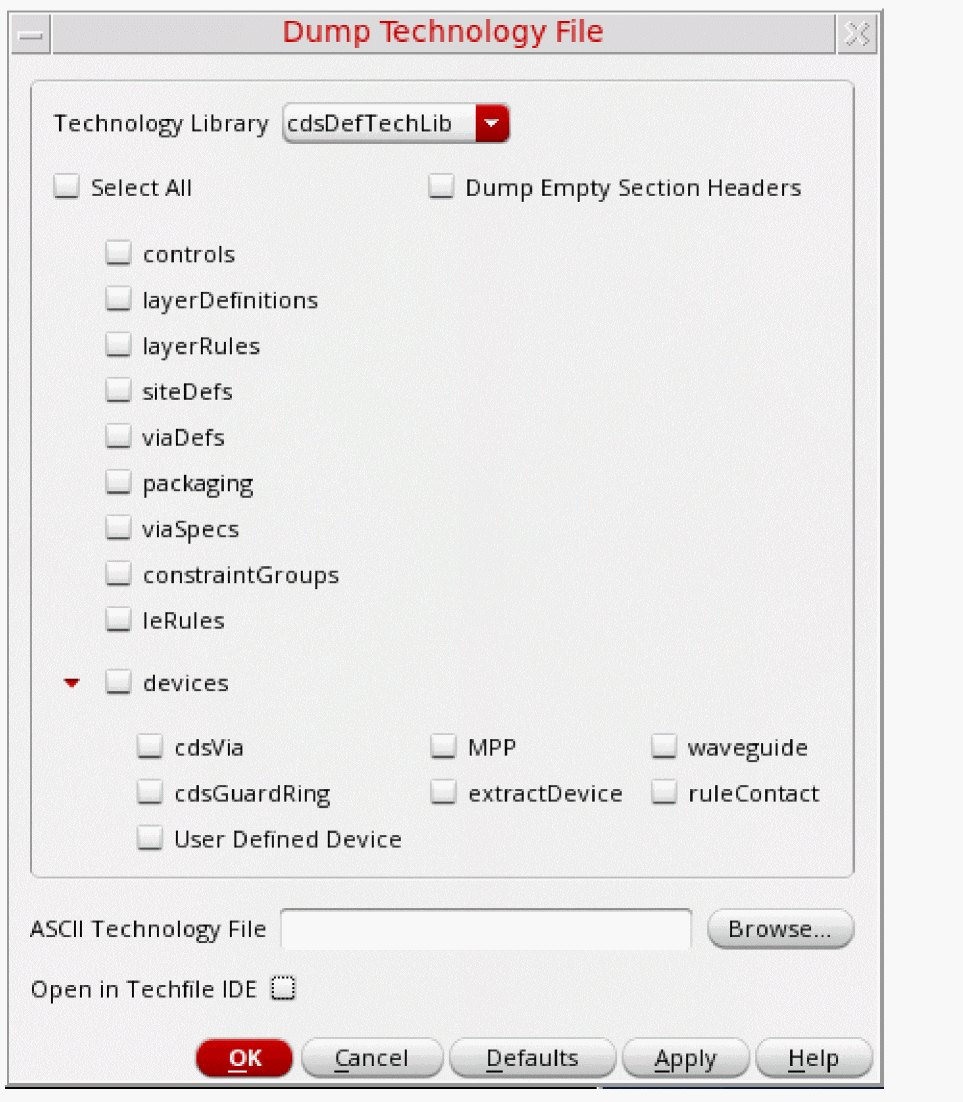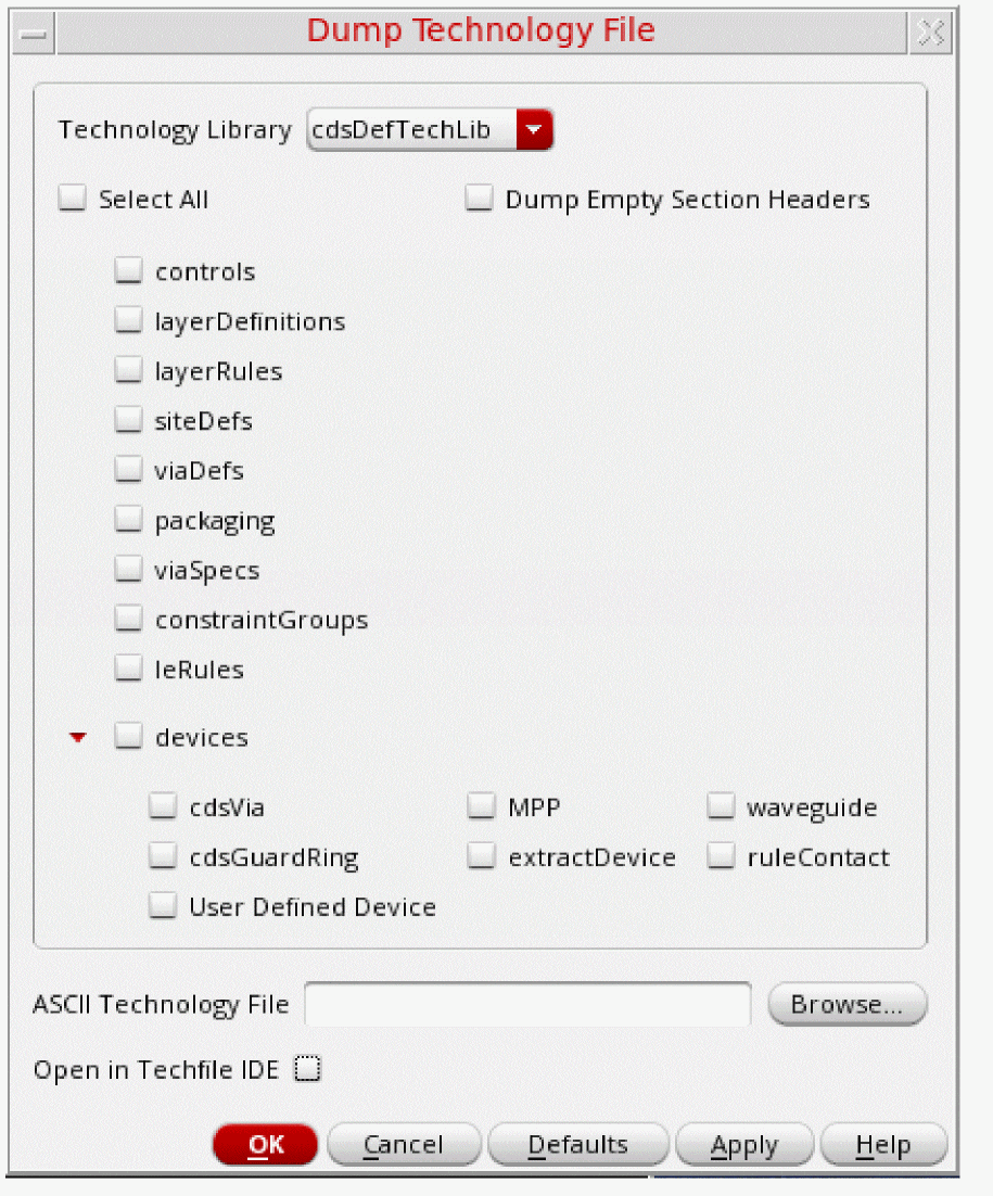 Select the sections of the technology file that you want to dump.