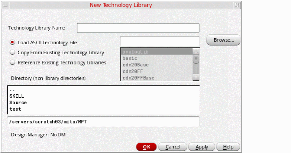 - In the Technology Library Name field, type the path and name of the technology library to create. (You can navigate your directory structure in the Directory list box.)