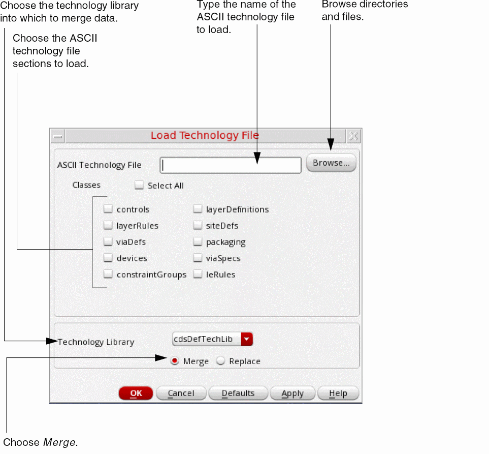 You can define new or edited technology data in an ASCII technology file and then merge that data with an existing technology library by compiling and loading the new technology file according to the following steps (refer to “Replacing Existing Technology Data in a Technology Library” for information on replacing the technology library). Merging new technology data does not alter existing technology file data that is not specified in the ASCII technology file being merged into the technology library.