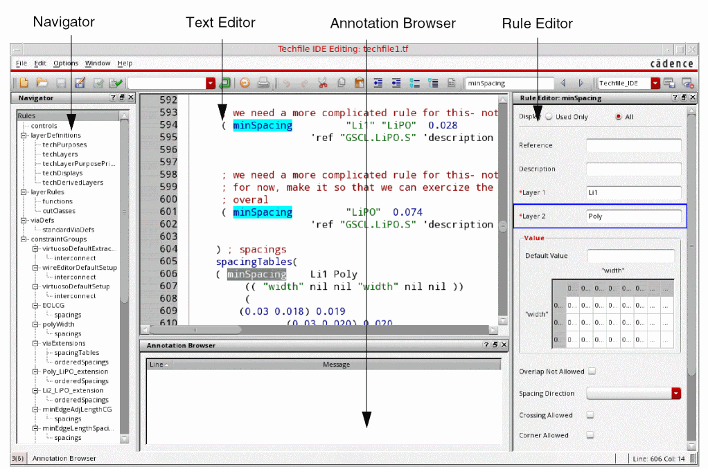 The Techfile IDE makes it easier for you to understand, write, and modify ASCII technology files, particularly constraints. It also helps you visualize the organization of constraints in constraint groups in a compiled technology database.