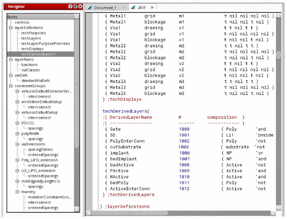 - Navigator: An assistant that shows a hierarchical list of the contents of the technology file. The entries at the primary level are constraint groups and those at the secondary level are types of constraints. You can click a node or leaf to jump to it in the editor. See “Navigating through a Technology File”.