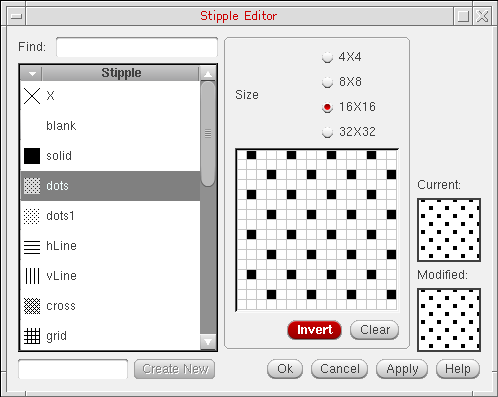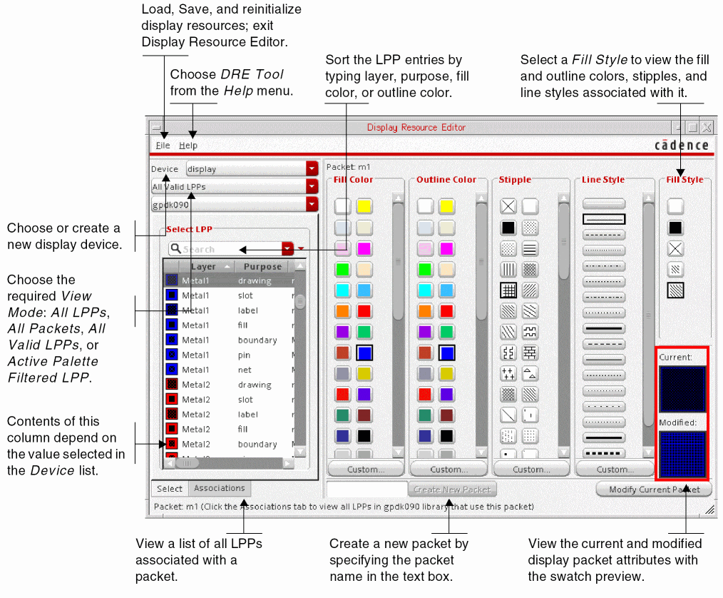 - Use the Display Resource Editor form to work with display resources. For example, you can add and edit display packet definitions; add colors, stipple patterns, and line styles; edit colors, stipple patterns, and lines styles; and add display devices you want to use during a design session. For more information, see Using Display Resource Editor.