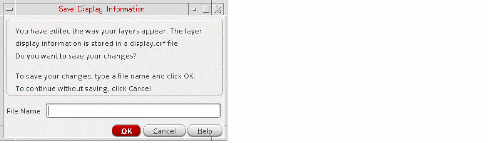 If you did not save your changes while exiting Display Resource Editor (or if you made changes using SKILL functions), the Save Display Information form, shown below, is displayed when you exit Virtuoso. Type a filename in the File Name field and click OK to save your changes, or click Cancel to discard your changes.