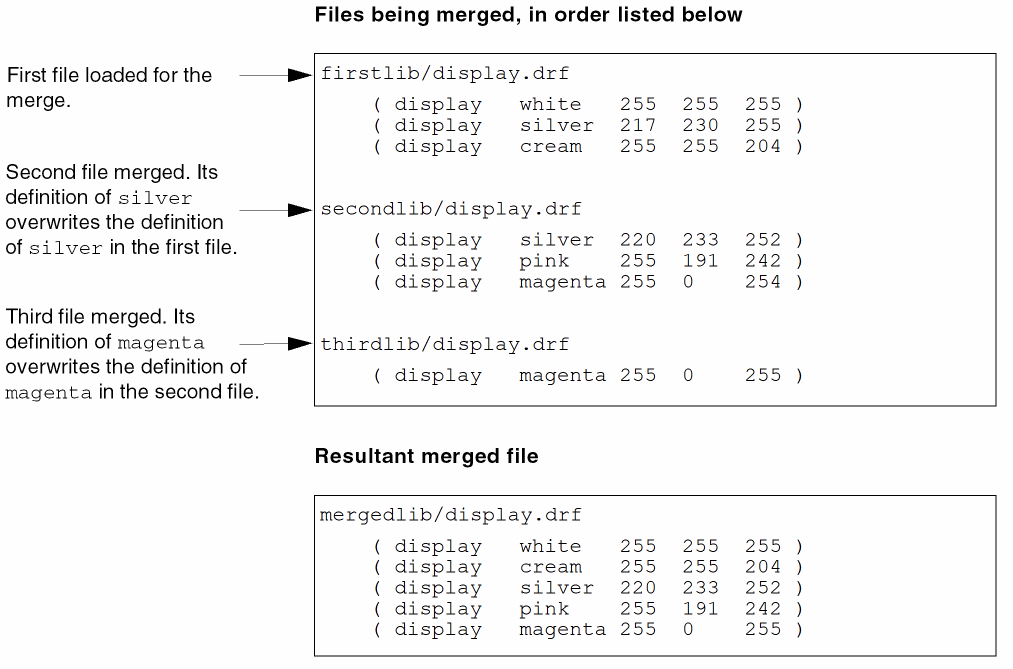 While working on a design, you can merge multiple display resource files into one file, and, if required, load this file into virtual memory. During the merge operation, if a resource is defined in more than one display resource file, its definition in the last merged file overrides any other definitions. Therefore, to obtain the results that you want, you must be aware of the resources defined in the various display resource files that you want to merge and the order in which these files should be merged.