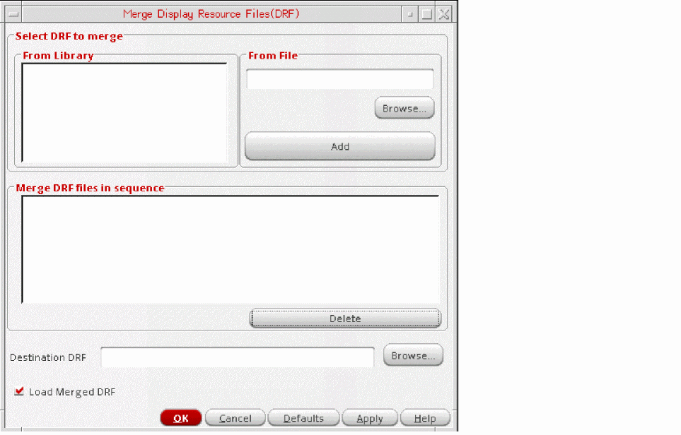 - In the From Library list box, select a library name. The name of the display resource file stored in that library appears in the Merge DRF files in sequence list box, along with the location where it is stored.