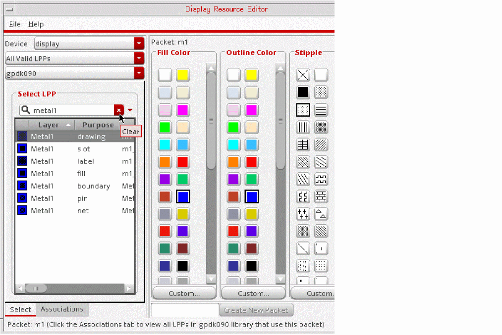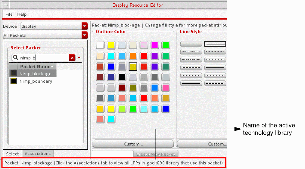 The Fill Color, Outline Color, Stipple, and Line Style attributes currently set for the selected packet are highlighted in the right pane.You can also set the view mode to All LPPs, All Valid LPPs, or Active Palette Filtered LPPs to select an LPP, if required. This displays in the right pane the attributes of the display packet used by the selected LPP. Several LPPs can share the same display packet. Therefore, when you change the display packet definition for one LPP, the appearance of all other LPPs that use the display packet is updated. To view a list of LPPs that use the same display packet, click the Associations tab. - Select the required Fill Color, Outline Color, Stipple, and Line Style attributes for the display packet.