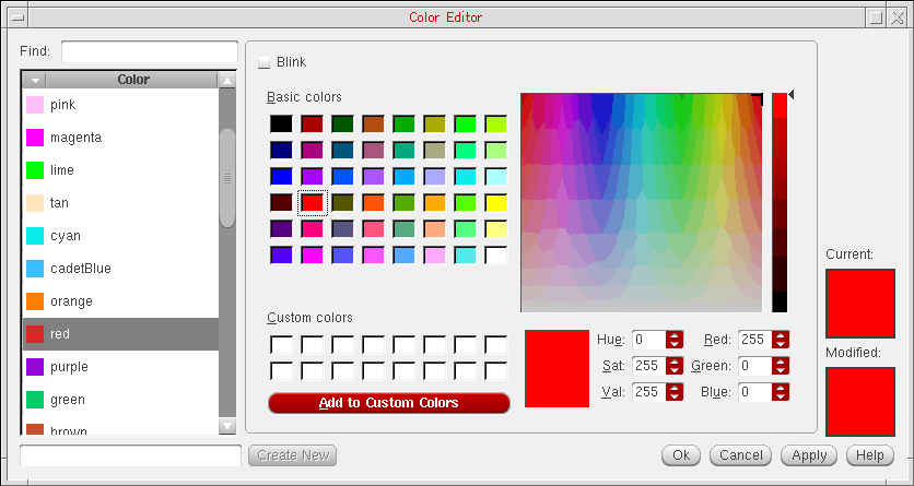 The color corresponding to the specified values is displayed in the Modified swatch area. - Select the Blink check box to make the color a blinking color.
