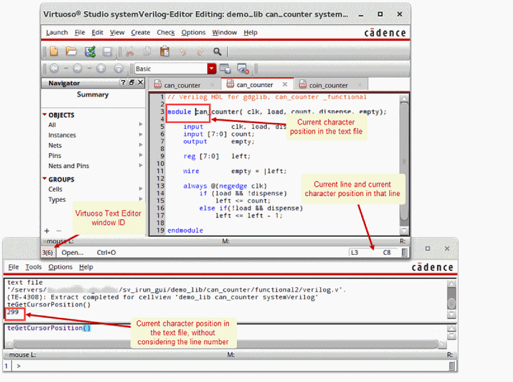 Place the cursor after module and just before can_counter on the second line. As illustrated below, run teGetCursorPosition from Virtuoso CIW to get the character position. Run teSetCursor to place the cursor on the fifth character. Notice that the line and character position displayed at the bottom-right corner of the Virtuoso Text Editor window becomes L1 C6 for line 1 and character 6. Run teGetCursorPosition again. Now, place the cursor in the begining of the text cellview using teSetCursor for the window ID 2.