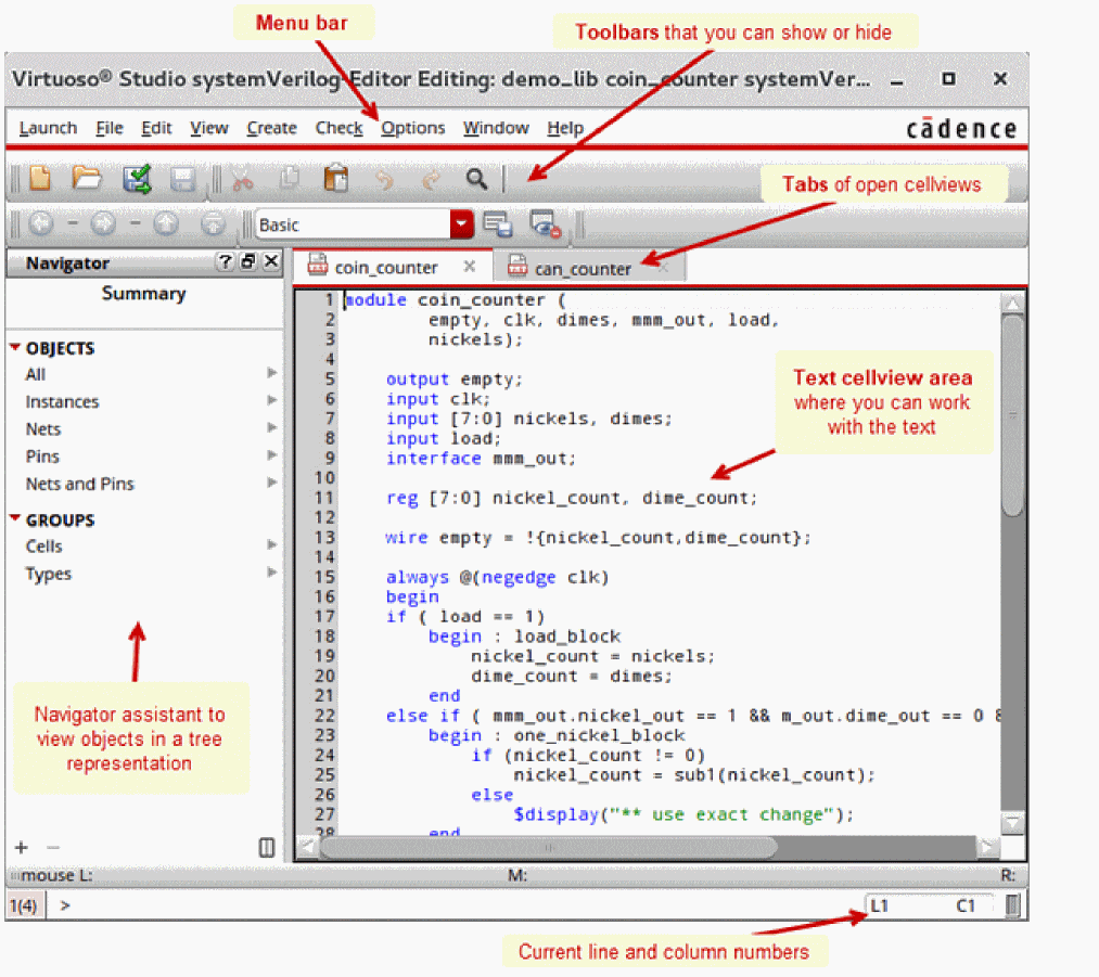 Virtuoso® Text Editor lets you work with the text cellviews stored in HDL files, such as Verilog, SystemVerilog, VHDL, PSpice, HSPICE, Spectre, and SPICE text files, in Virtuoso libraries. You use this application to perform the following tasks: