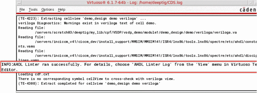 Enable AHDL Linter Static Check– Enable AHDL Linter static check in Virtuoso Text Editor. You can also enable this check by using “enableAhdllintStaticCheck”. When you check the syntax, save the text cellview file, and create the database of instances, nets, and pins in the text cellview, you see following message in CIW.