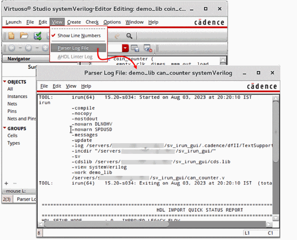 Virtuoso Text Editor uses the appropriate parser to parse the file of a text cellview to perform operations, such as generating the cellview database. When the parser processes a file, it maintains a log. You can view this log for details. For example, you can view the log to investigate parse errors.