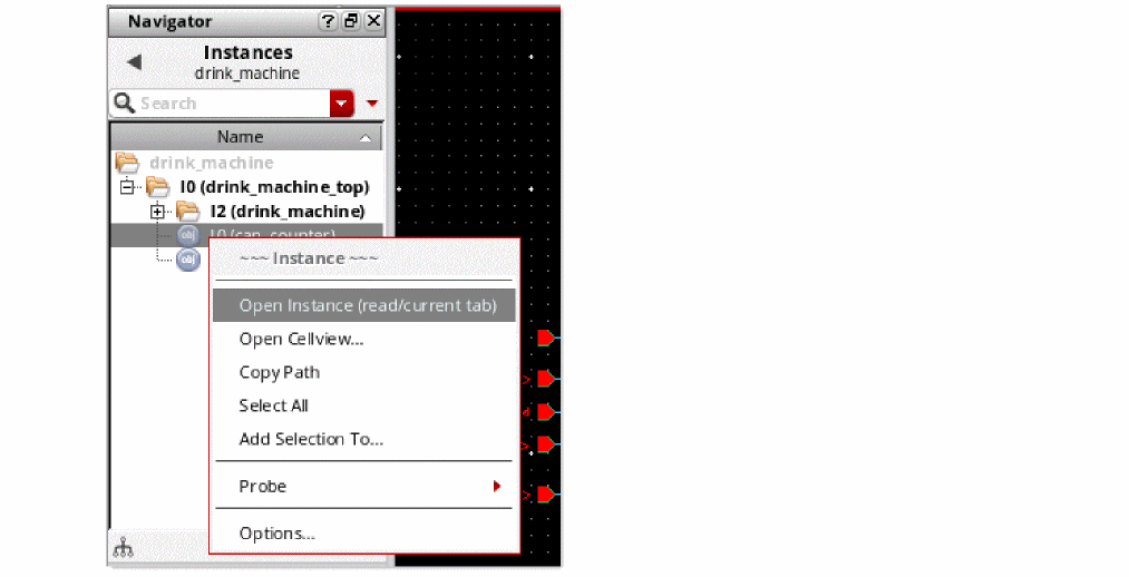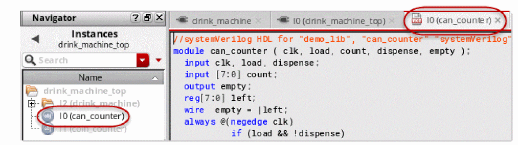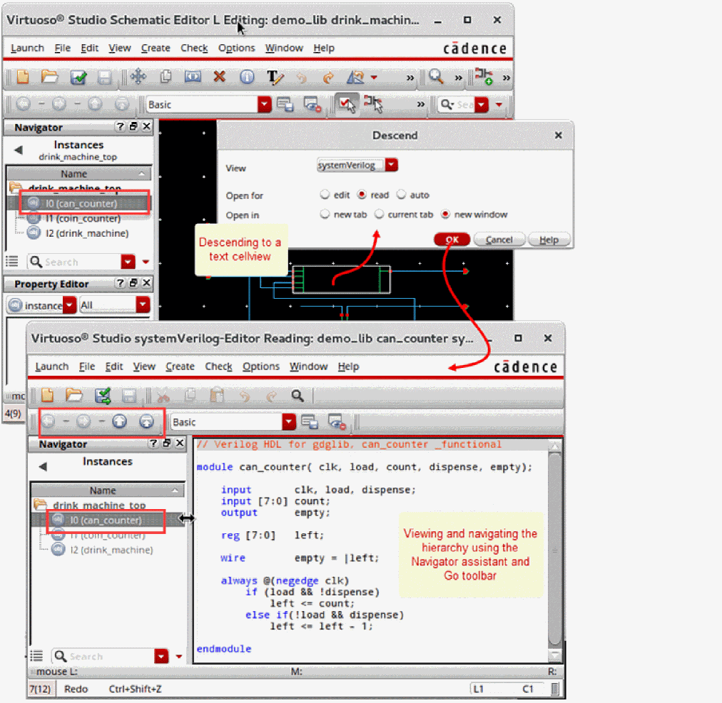 You can instantiate a symbol of a text cellview in a schematic view. You can then descend to this text cellview from the schematic view. The following figure illustrates how you navigate a design containing text cellviews. In this example of the drink_machine design, the drink_machine_top schematic view contains the symbol of the SystemVerilog text cellview can_counter. The figure illustrates how you can descend to can_counter instance I0 from drink_machine_top.