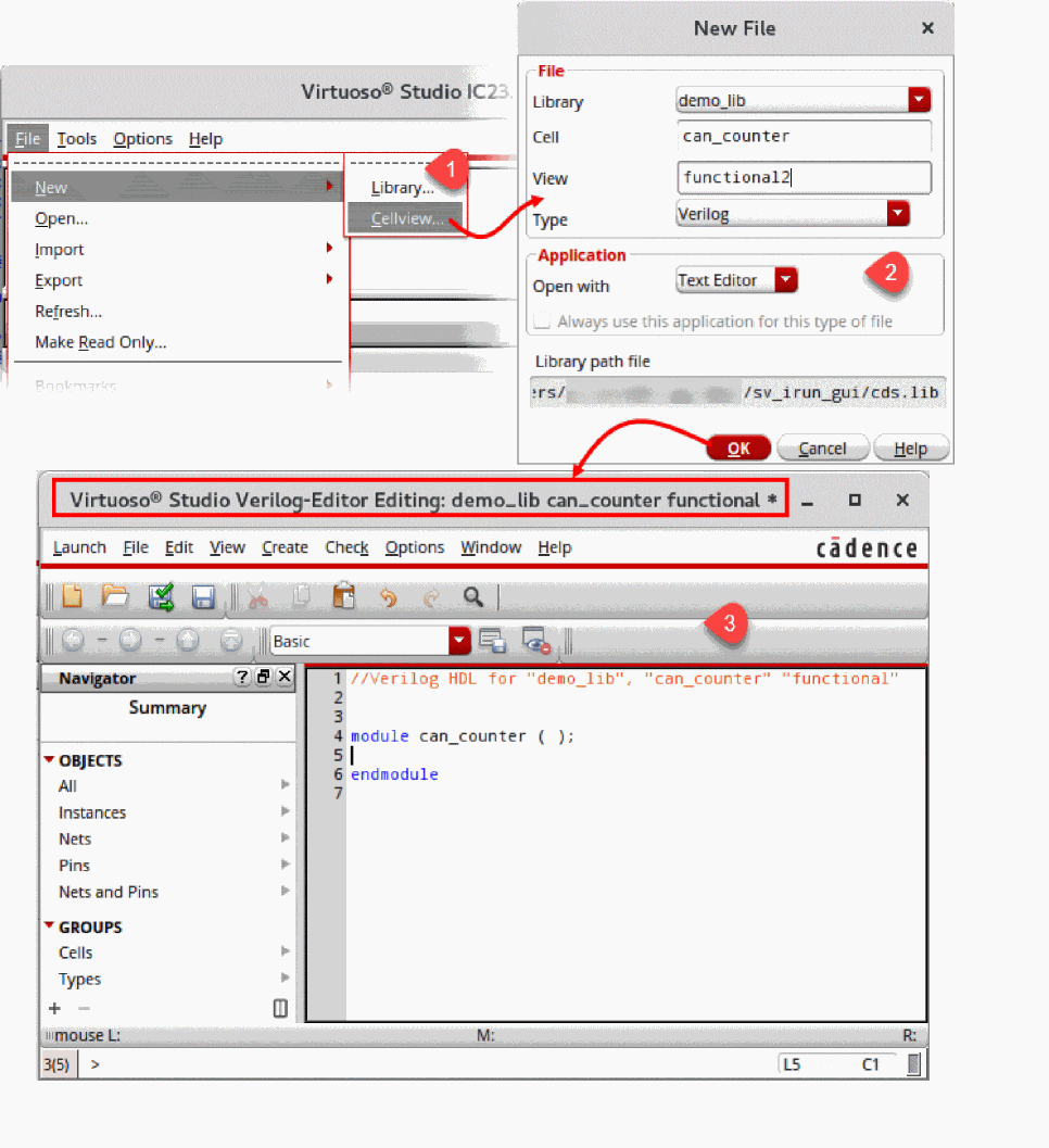 - The feature to create a new cellview from another cellview in Virtuoso Text Editor is similar to the one in Virtuoso Schematic Editor. For details, see Automatically Creating a Cellview from Another Cellview in Virtuoso Schematic Editor L User Guide.