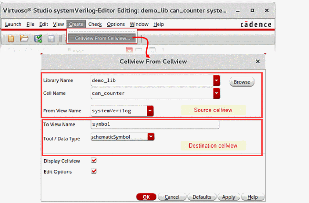 To create a cellview from an existing cellview, you specify the source library, cell, and view and the destination type and view. The destination cellview is created in the same source library and cell. Depending on the destination cellview type, you can provide additional information. For example, to create a symbol cellview from a Verilog cellview, you can choose to specify additional information, such as the left, right, top, and bottom pins.