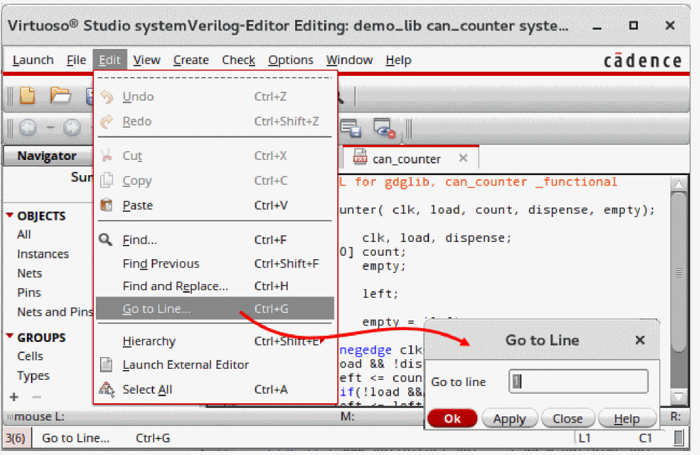 The Navigator assistant is available in Virtuoso Text Editor, Virtuoso Schematic Editor L and XL, and Virtuoso Layout Suite L. For details, see The Navigator Assistant in Virtuoso Schematic Editor L User Guide.