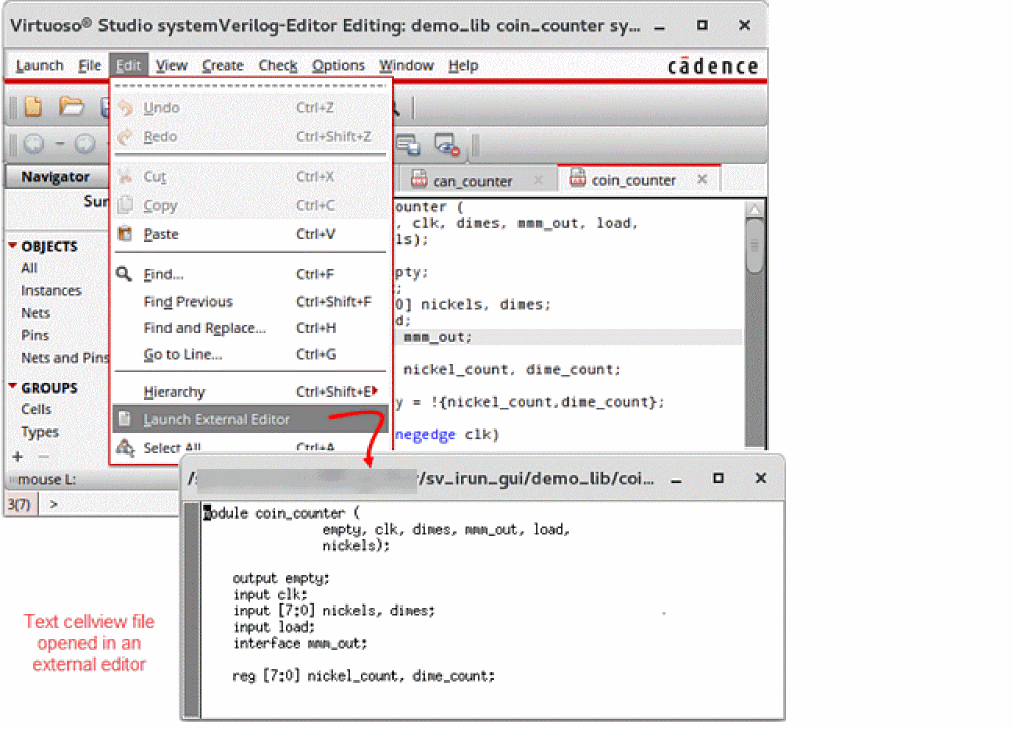 The following figure illustrates how you open a text cellview file in the external editor.