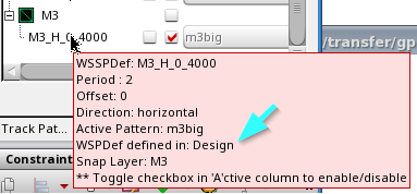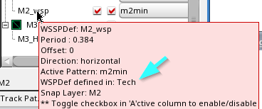 WSPs are defined in the technology file or in the design. To check where a WSP is defined, hover over the WSPDef in the Track Patterns table, and observe the details.