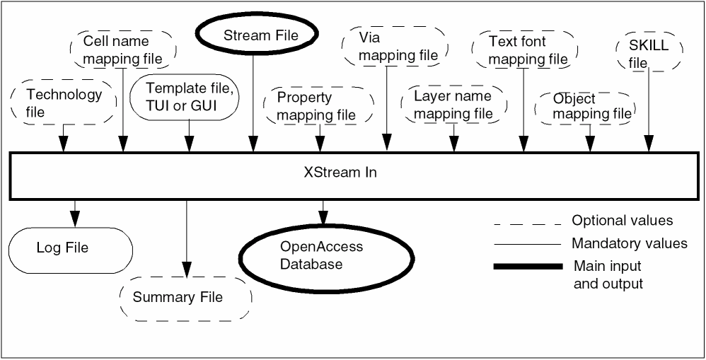 XStream In converts design data in the Stream format to designs in the OpenAccess database. The inputs to the XStream In process are XStream In options, optional mapping files, user-defined SKILL files, and technology file information. After the design has been streamed in, the log file, the summary file, and the OpenAccess library are generated.