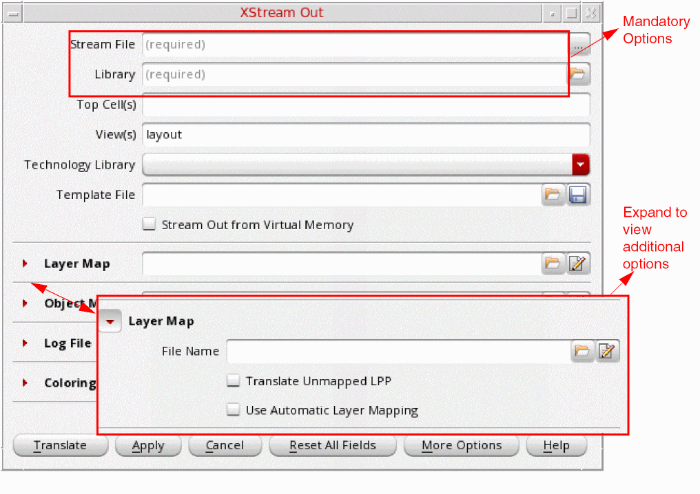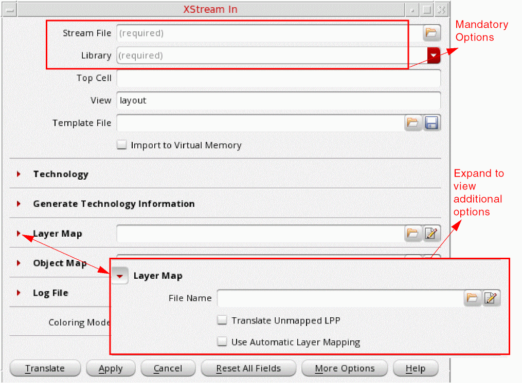 The main XStream In form comprises mandatory options that are essential to run the translation. The form also comprises a few other most commonly used options, such as Layer Map and Object Map.