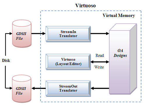 - Virtuoso XStream In translator reads a GDSII file from the disk and creates an OpenAccess design in the virtual memory.